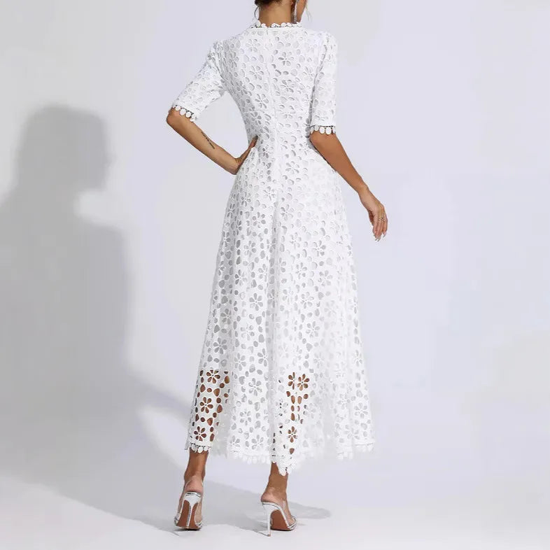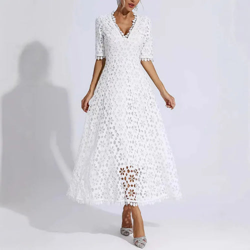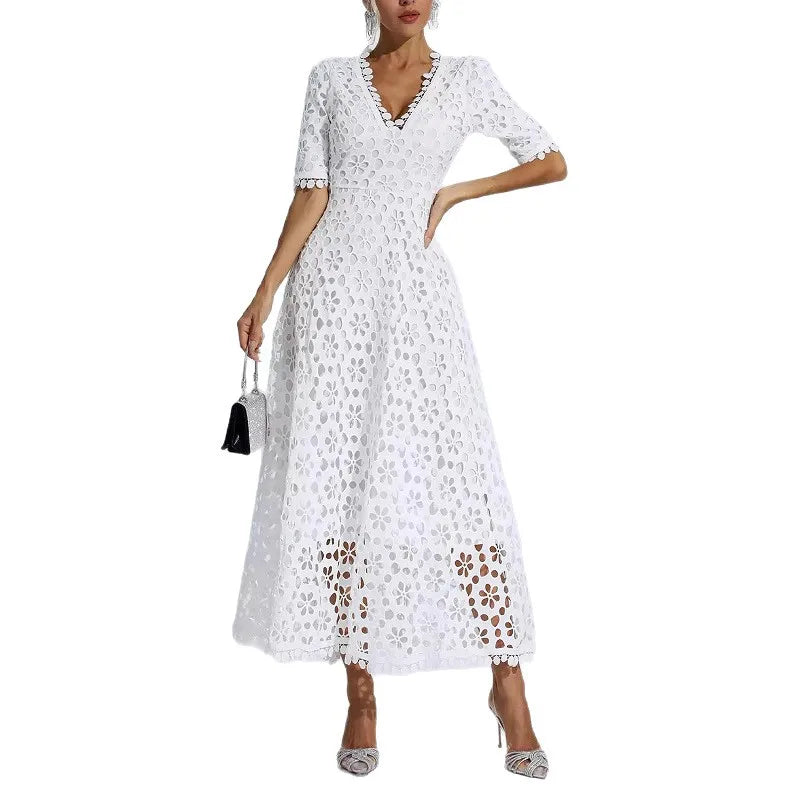 Elegant White Long V-Neck Dress Deep V-Line Waist-Cinching Maxi Lace Dress For Women High Waist Ankle-Length Commute Style