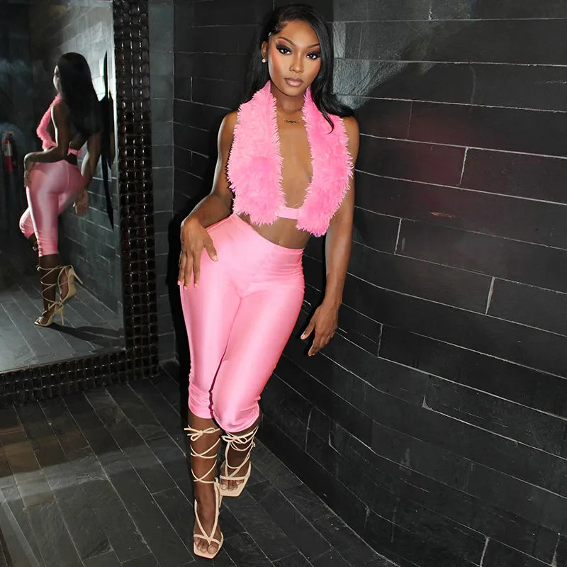 European Style Faux Fur Two-Piece Set With Belt Seven-Foot Pants Sleeveless Backless Fashion Casual Outfit For Women