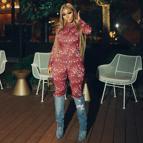 European Style Women's Long Sleeve Bodysuit Leopard Print Mesh Halter Neck Tight Fit Trousers Fashionable Streetwear