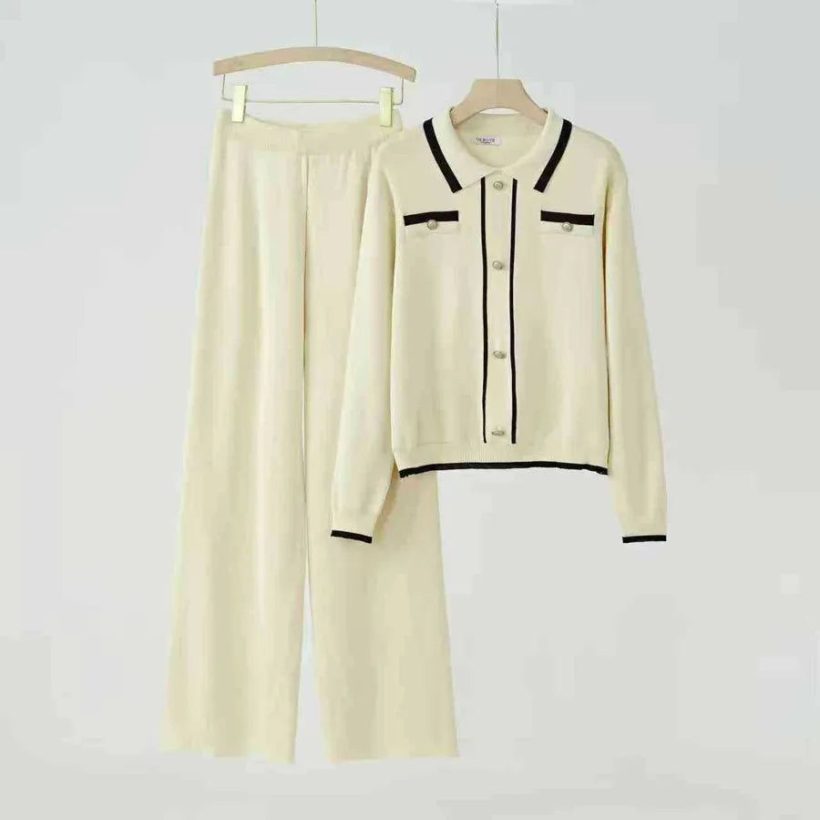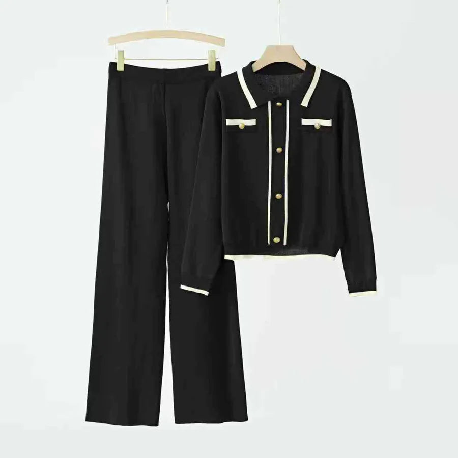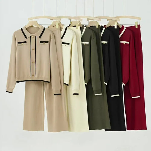 Fall Fashion Casual Knitted Long Sleeve Shirt And Wide Leg Pants Two Piece Set For Women Elegant Commute Style Polyester Fabric