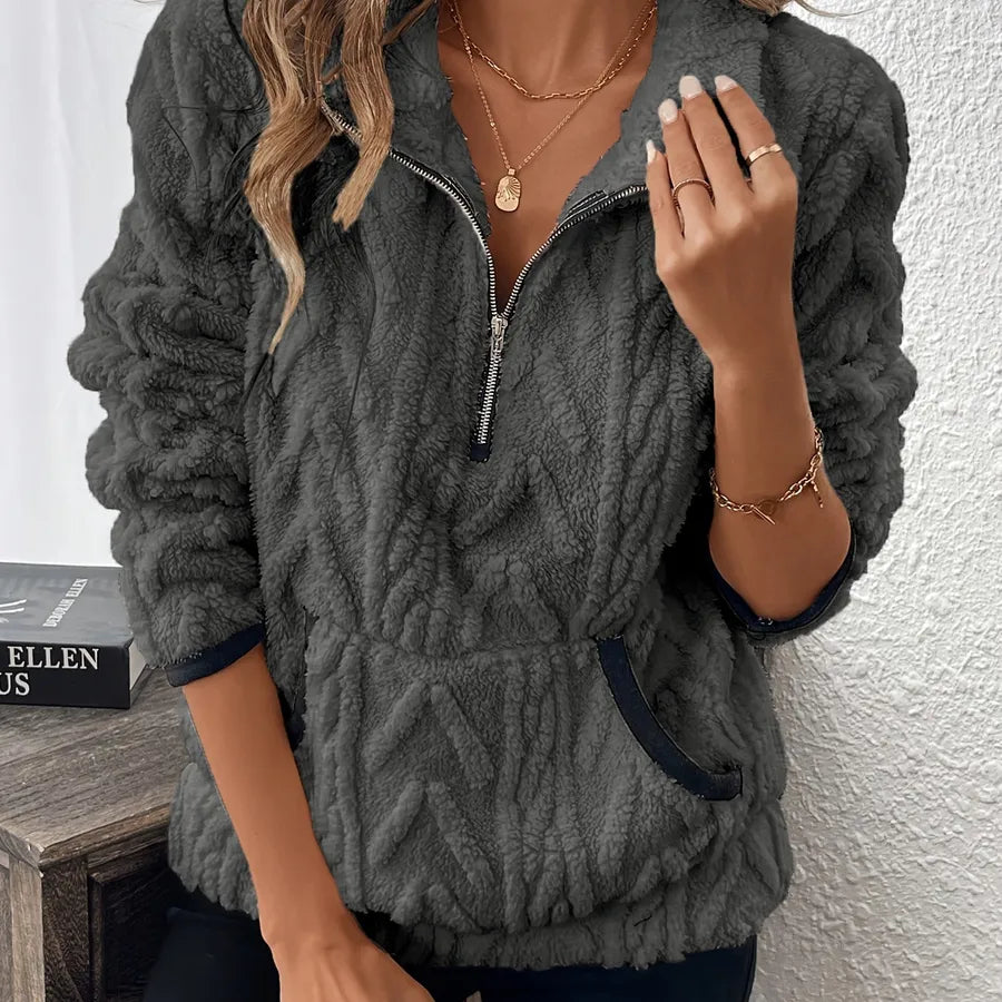 Fall Winter Short Plush Hoodie Half Zipper Turn-down Collar Embroidery Style Commute Fashion Women's Sweatshirt