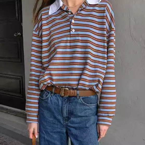 Fall Winter V-neck Color Block Striped Long Sleeve T-shirt Elegant Commute European Style Fashionable Versatile Mid-Length Top