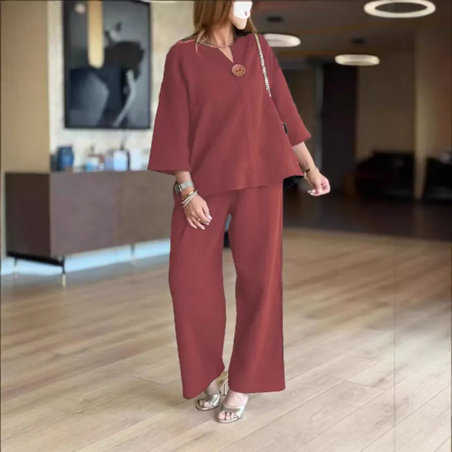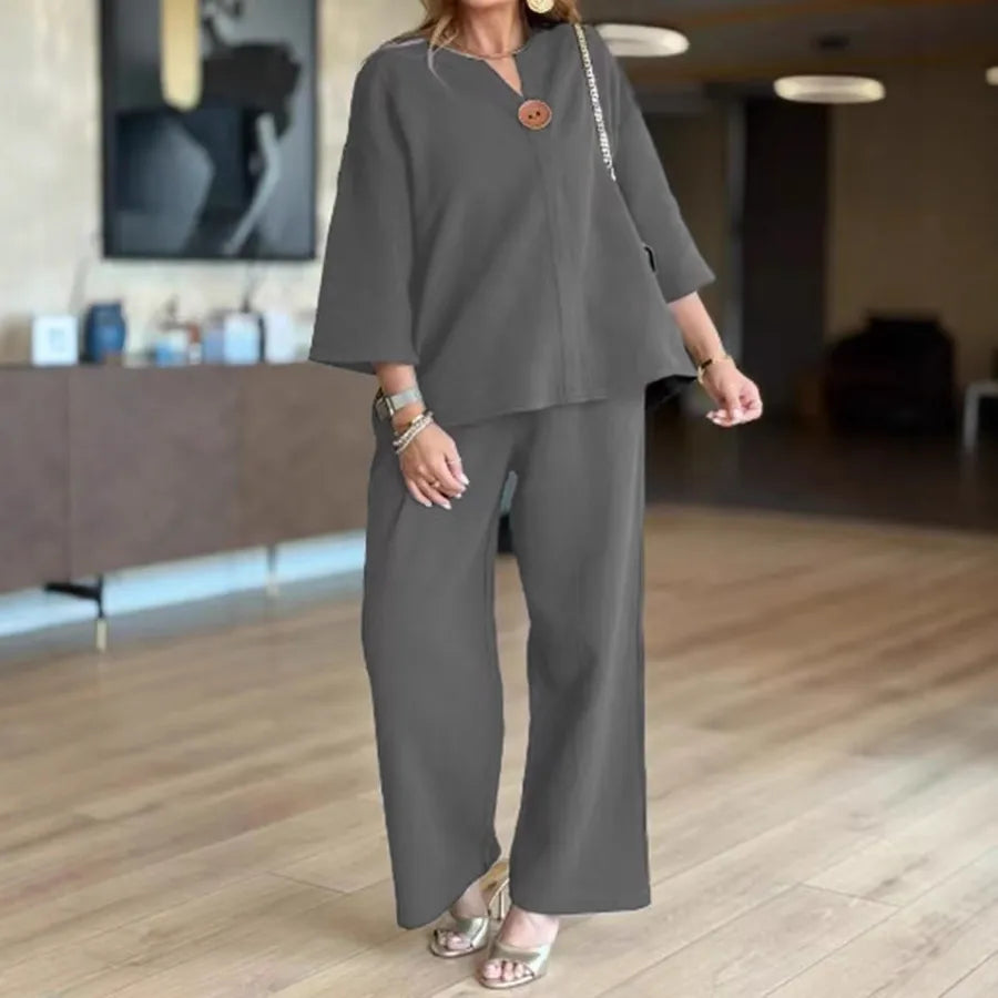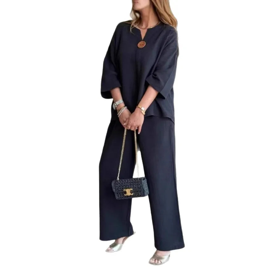 Fashionable Casual Cotton Linen Solid Color Shawl Wide Leg Pants Top Set Autumn New Arrival Women's Ensemble Style