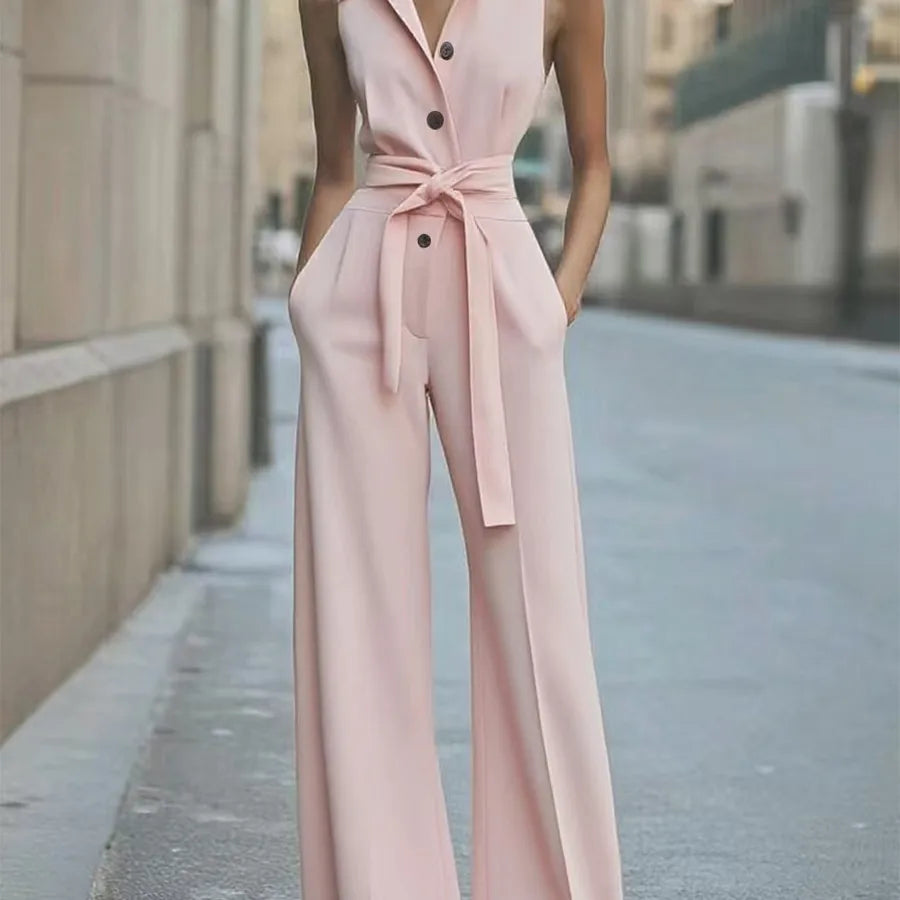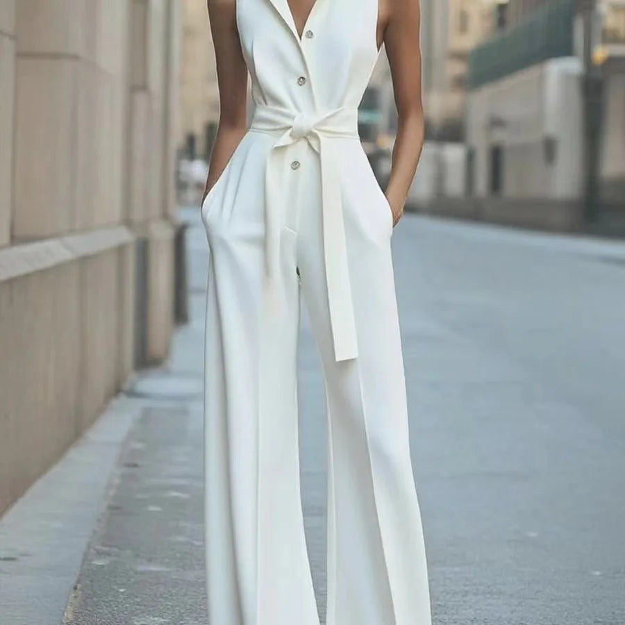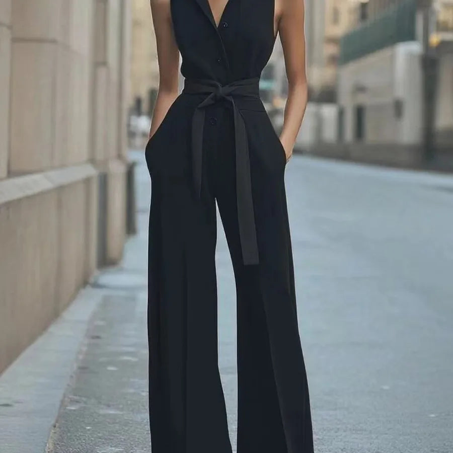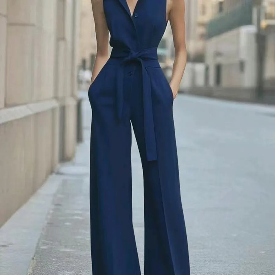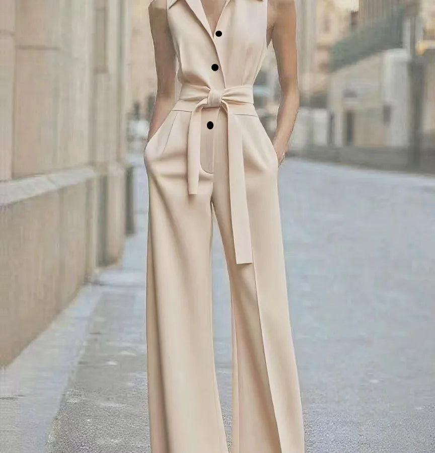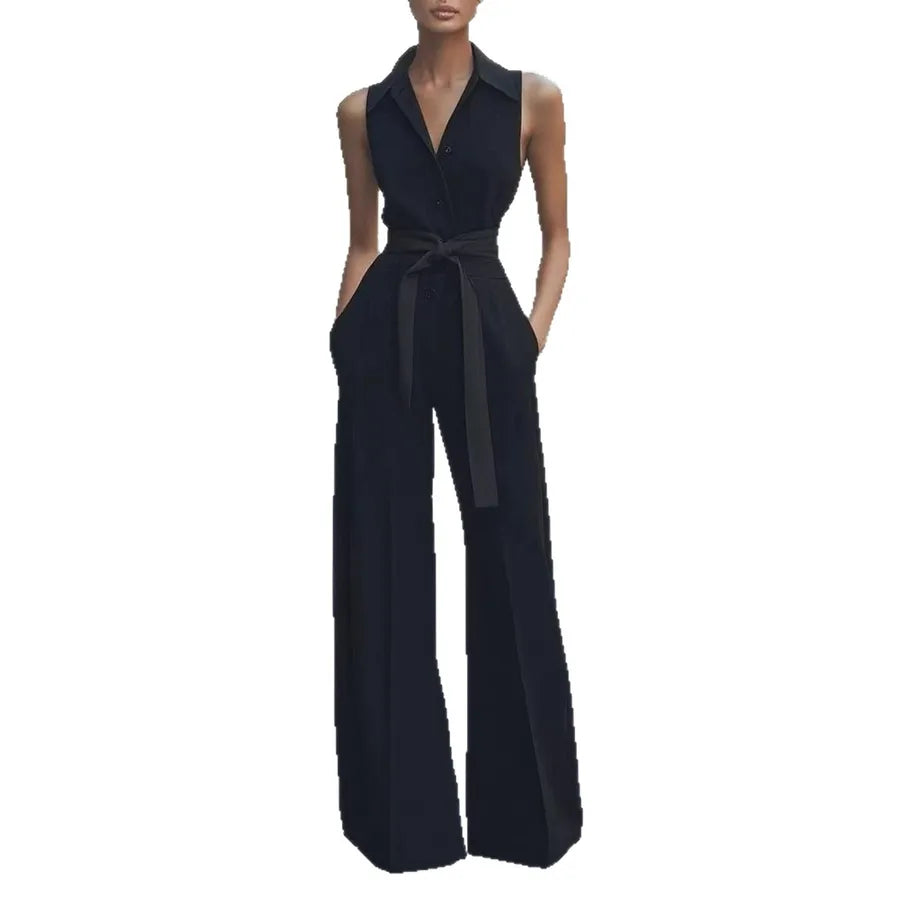 Fashionable European Style Office Pantsuit Pure Color Wide Leg Shirt Collar One-Piece Suit For Women Commute Workwear