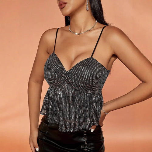 Fashionable Glitter Backless Strap Top Women's Sexy Personalized Street Style Short Length Slim Fit Polyester Fabric T-Shirt