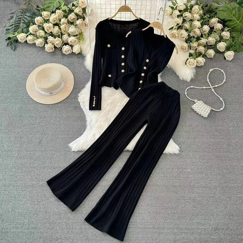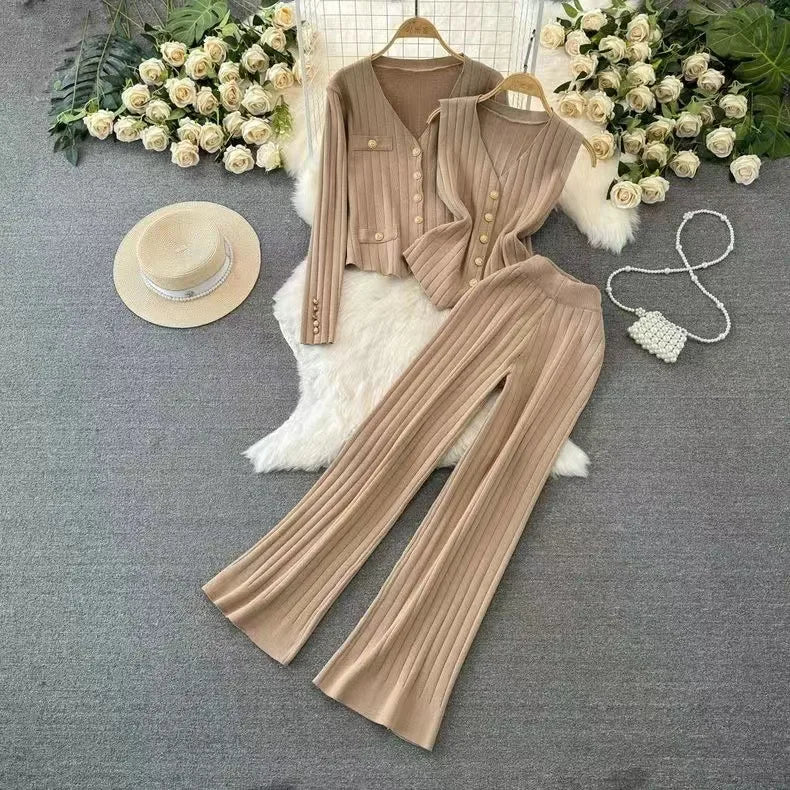 Fashionable New Style Women's Knitted Long Sleeve Collared Set Three Pieces Vest High Waist Straight Leg Pants Casual Outfit