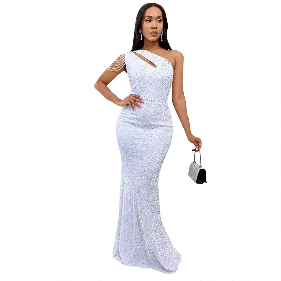 Fashionable Sequin One-Shoulder Backless Fish Tail Evening Dress Sexy Style Polyester Fabric Sleeveless Gown For Women