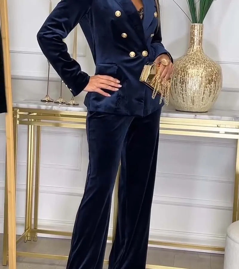 Fashionable Velvet Two-Piece Suit Set For Women Autumn Winter Double-Breasted Elegant Commute Style Long Sleeve Pants