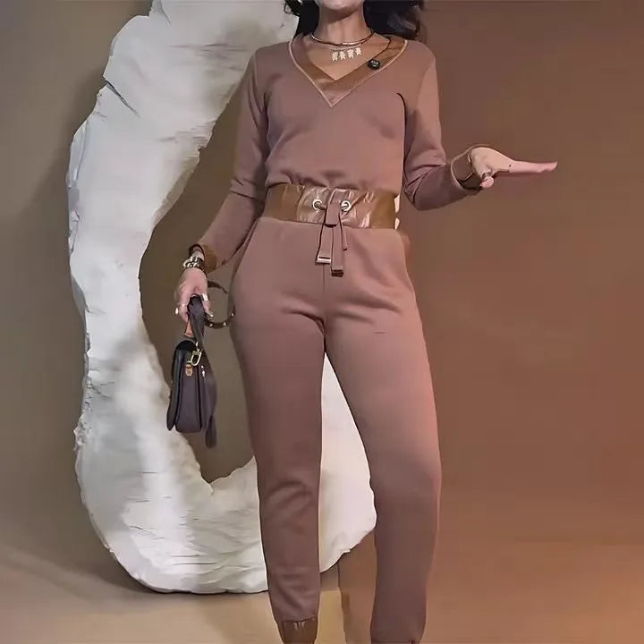 Fashionable Women's Patchwork Long Sleeve Two-Piece Set Casual Commute Elegant Style Polyester Fabric Regular Sleeve Long Pants