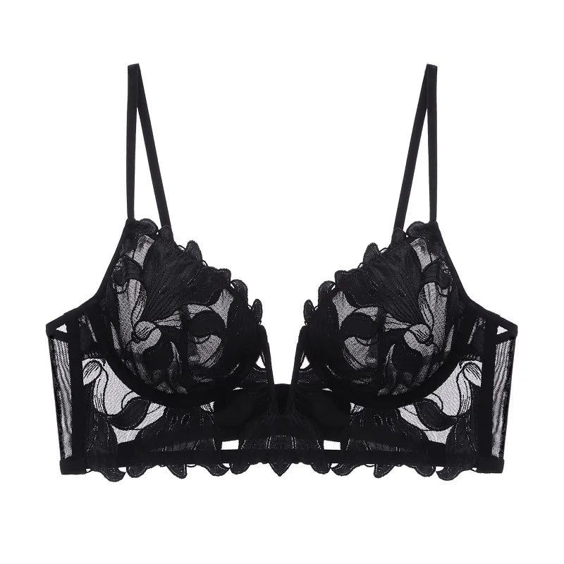French Lace Bra Set Women's Sexy Ultra-Thin Breathable Embroidery Underwear Nylon Polyester Fabric 3/4 Cup Gathered Small Chest Illusion