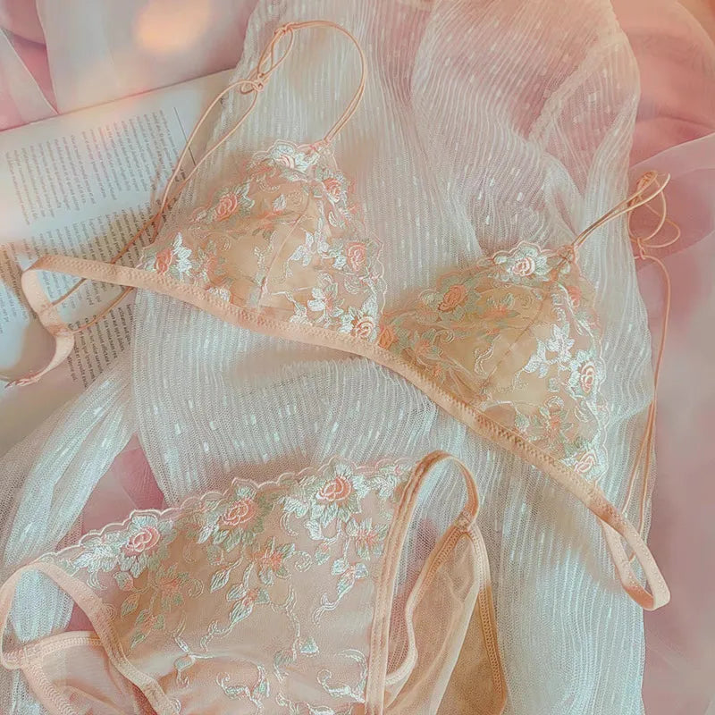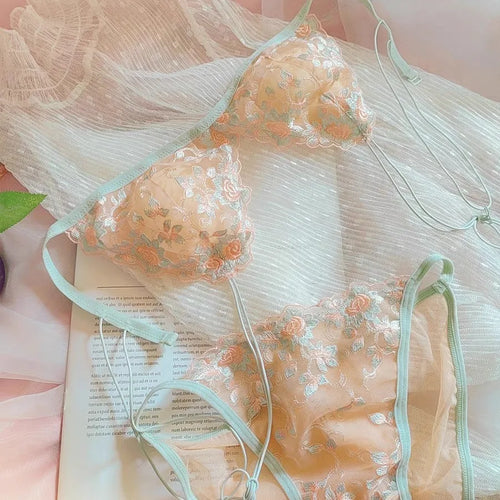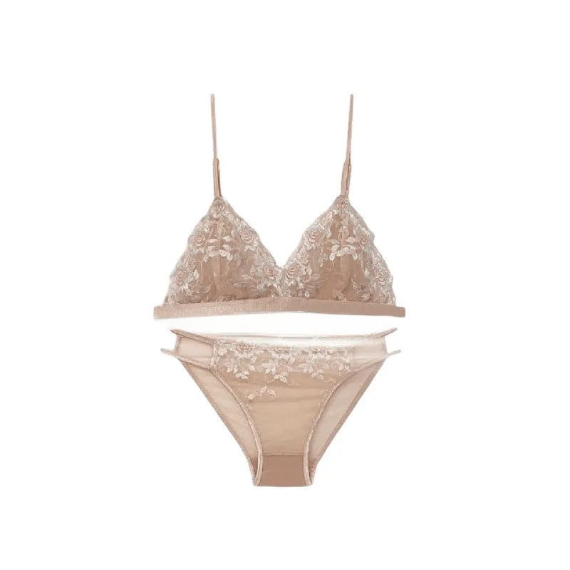 French Style Sexy Pure Desire Girl Ultra-Thin Embroidered Lace Underwear No Steel Ring Triangle Cup Beautiful Back Fine Strap Bra Set