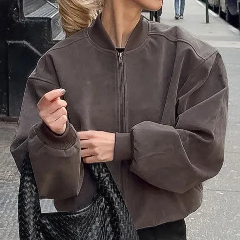 Gray Zipper Long Sleeve Pilot Jacket Women's Suede Leather Stand Collar Vintage Autumn Winter High Street Style Coat