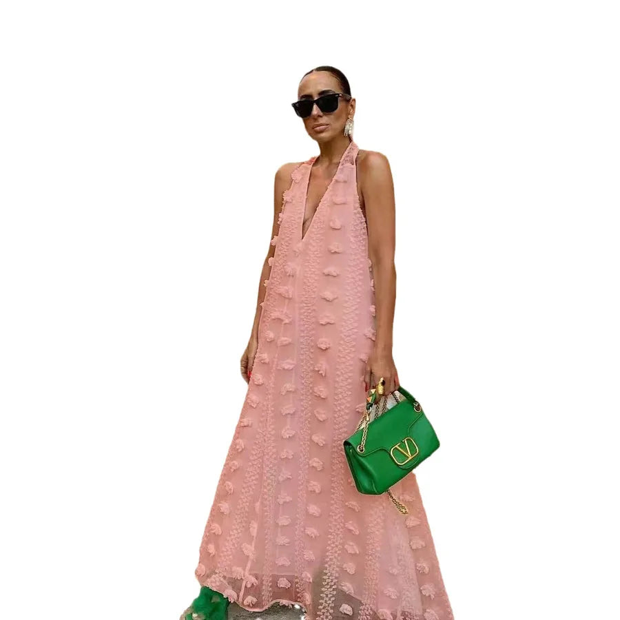 holiday style women's halter V-neck three-dimensional flower ribbon dress summer large swing skirt