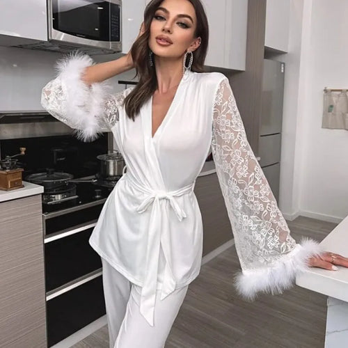 Home Women's Elegant Flower Polyester Milk Fiber Raw Hem Lace Pants Sets Pajama Sets