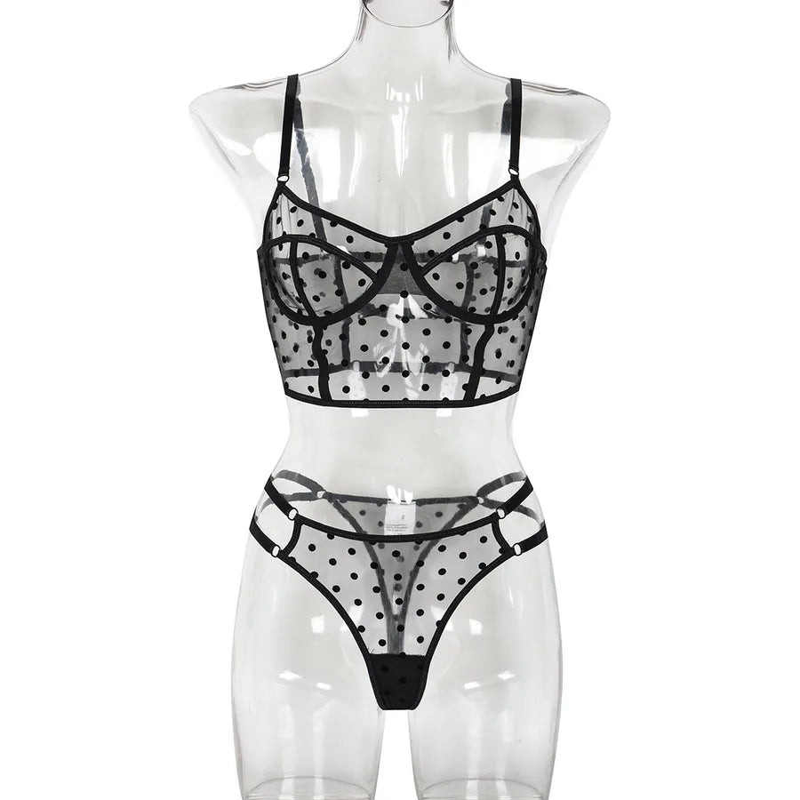 hot selling polka dot see-through sexy lingerie with steel ring elastic back hollow out two-piece set 3391