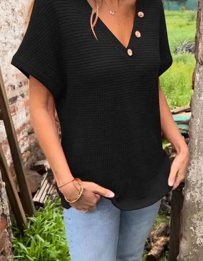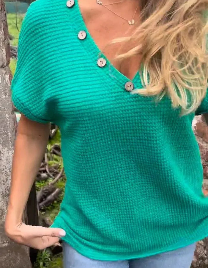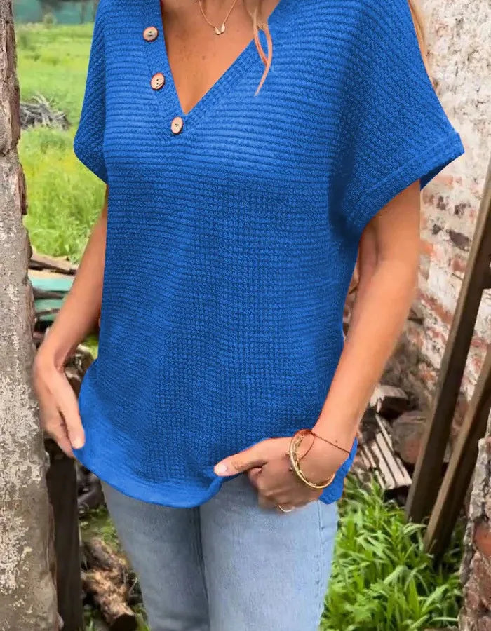 Knitted Short Sleeve V-Neck Button-Up Slim Fit T-Shirt Women's Fashionable European Style Top Sweet Fresh Pure Color Shirt