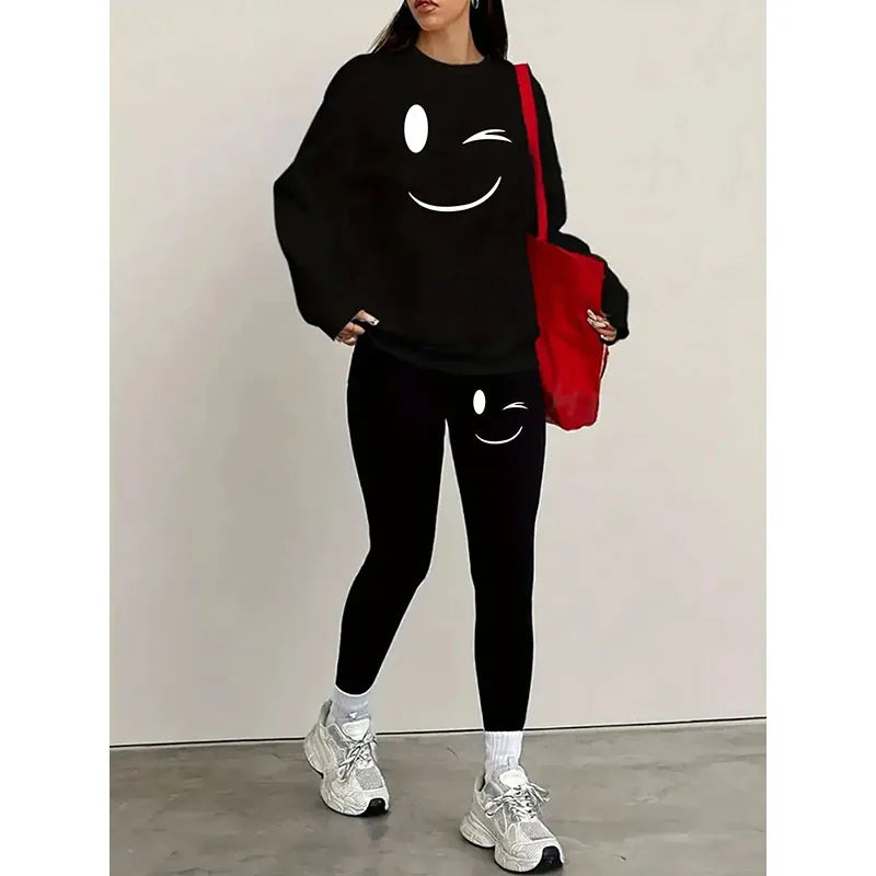 Ladies Casual Round Neck Printed Sweatshirt And Pants Two Piece Set Autumn Winter Fashion Comfortable Polyester Clothing