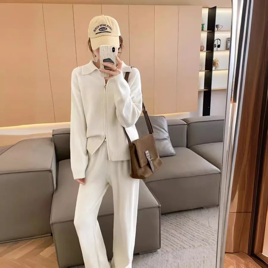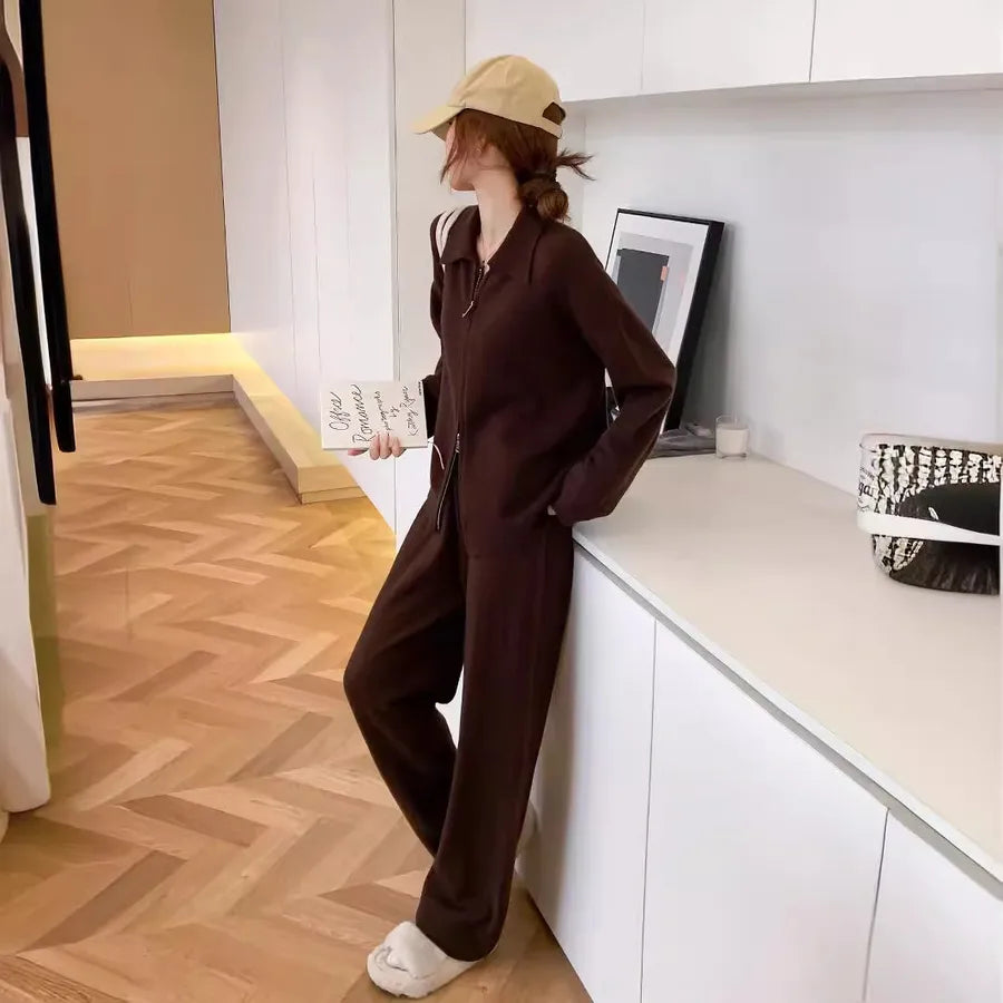 Ladies Fashion Lazy Style Knitted Cardigan And Wide Leg Pants Set Zipper Design Long Sleeve Pure Color Leisure Commute Suit