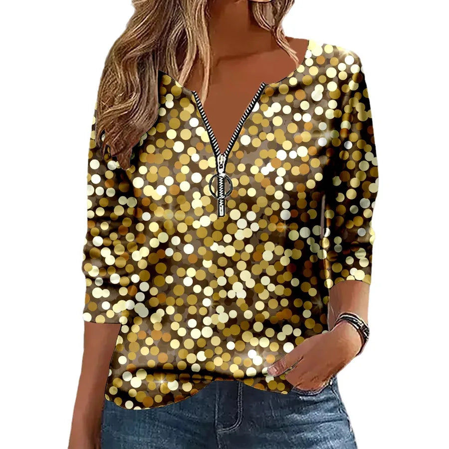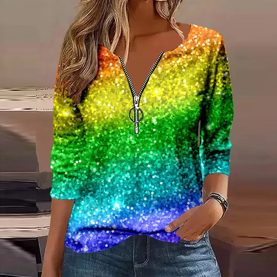 Long Sleeve Zipper V-Neck Women's T-shirt Digital Print Loose Fit Casual Style Polyester And Copper Ammonia Fiber Fabric