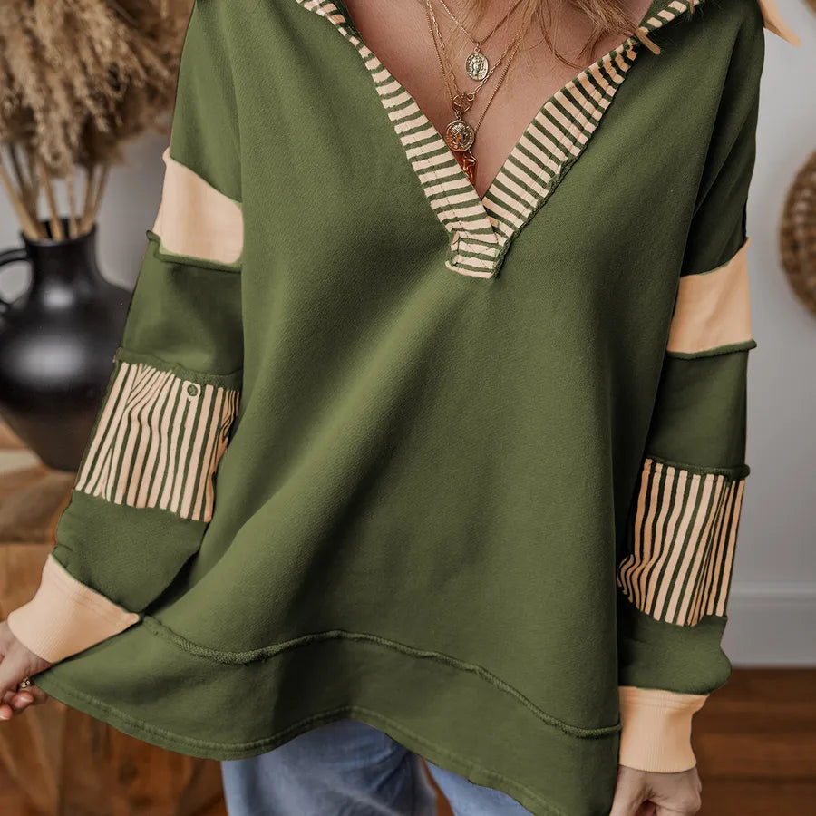 Loose Casual Long Sleeve Deep V Neck Sweatshirt Striped Color Block Hoodie Women's Comfortable Breathable Pullover Top