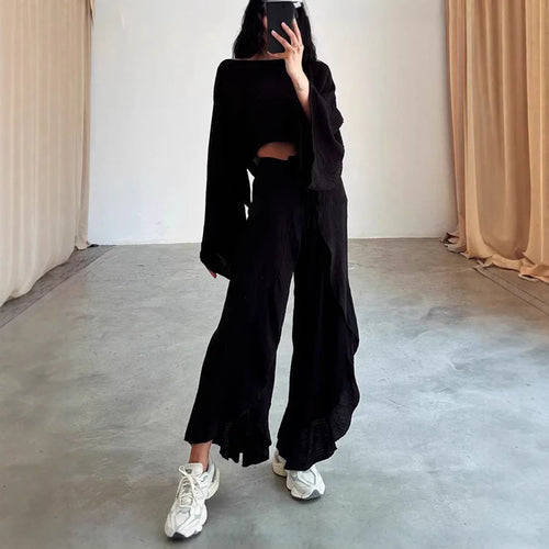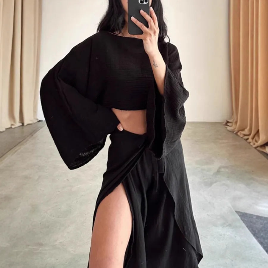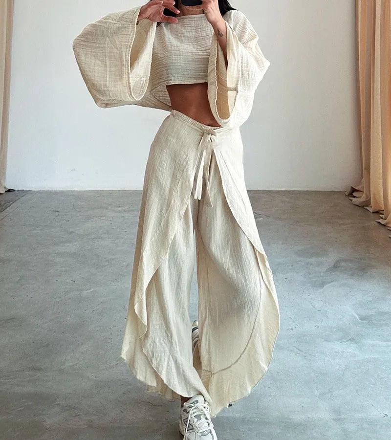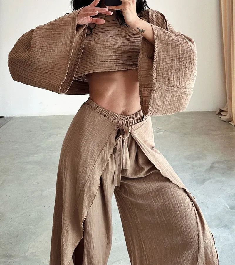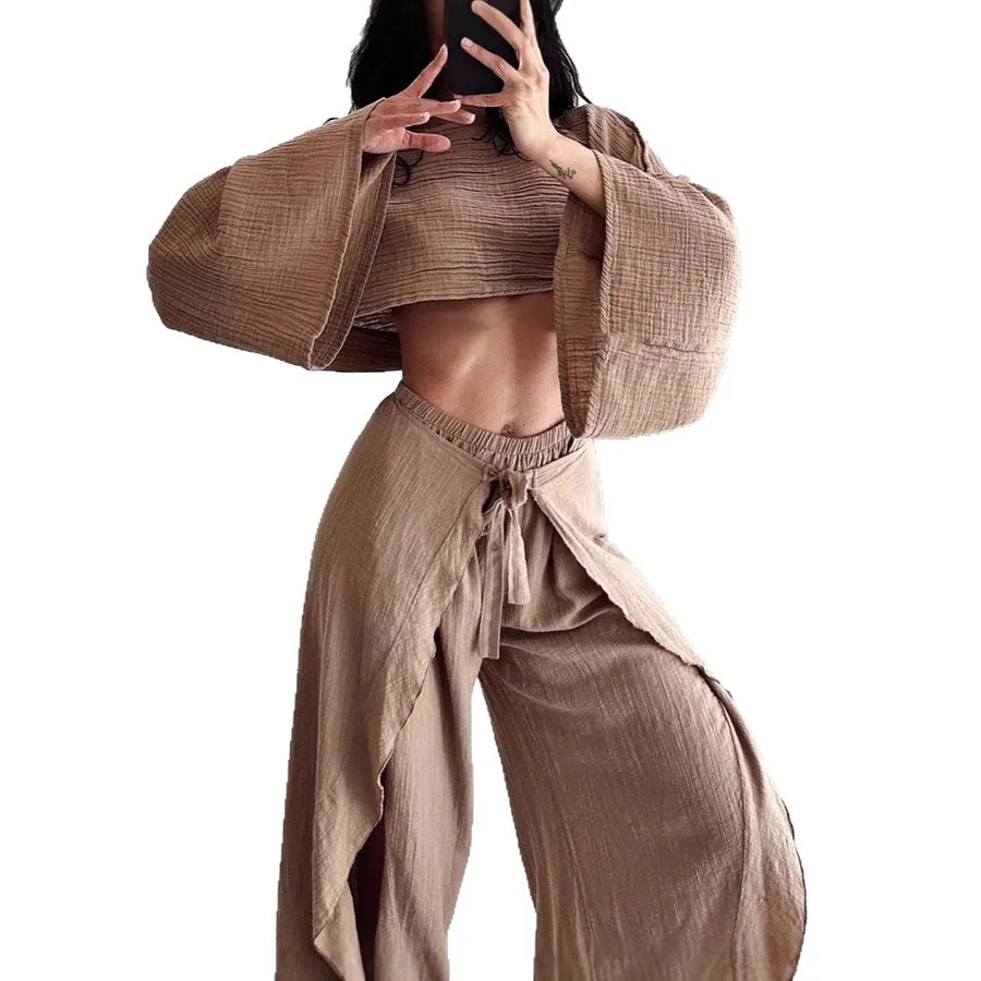 Loose Cotton Linen Women's Top And Pants Two-Piece Set Fashionable Casual Wear Pure Color Long Sleeve Patchwork Blouse