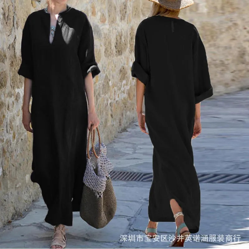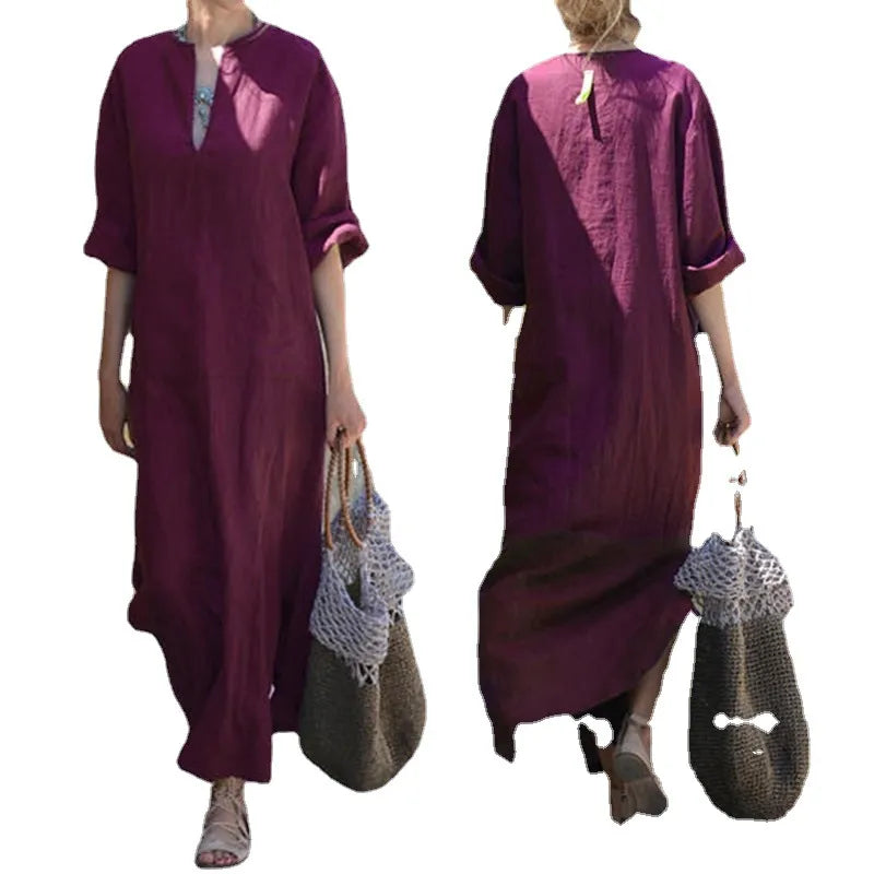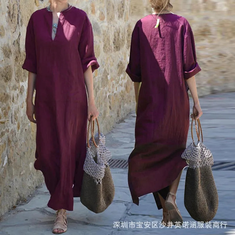 Loose V-neck Midi Sleeve Long Dress European Style Commute Wind Large Size Women's Cotton Blend Dress Casual Chic Dress
