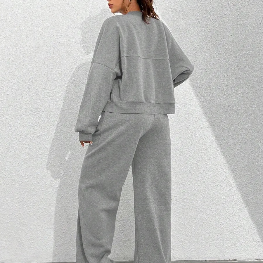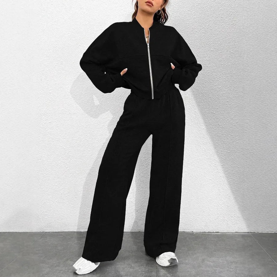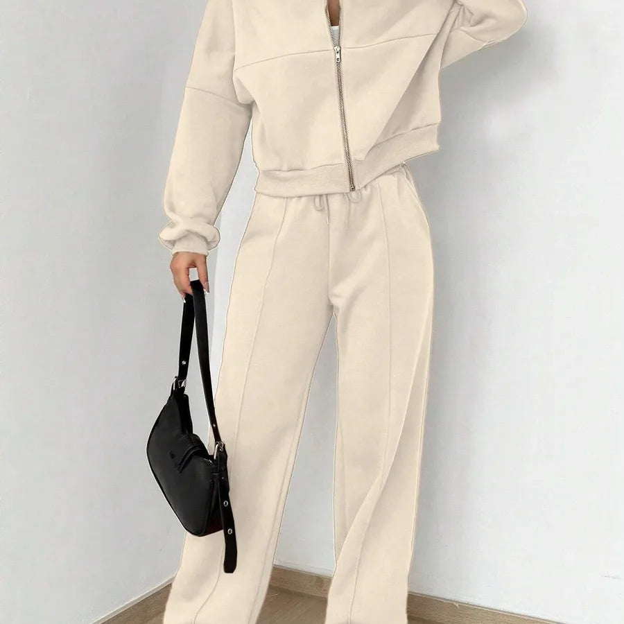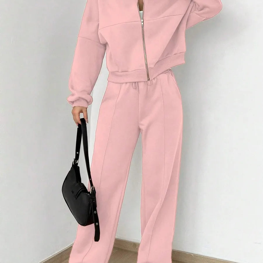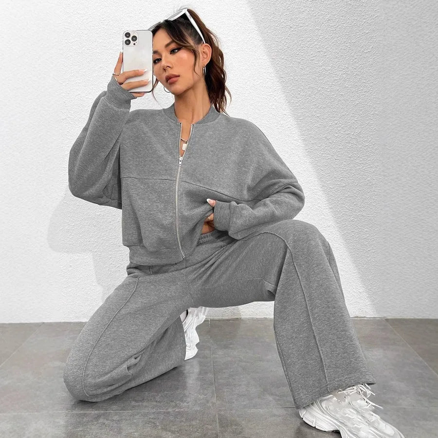New Autumn Fashion Solid Color Zipper Casual Sport Long Sleeve Top With Drawstring Leisure Pants Two Piece Set Women's Wear