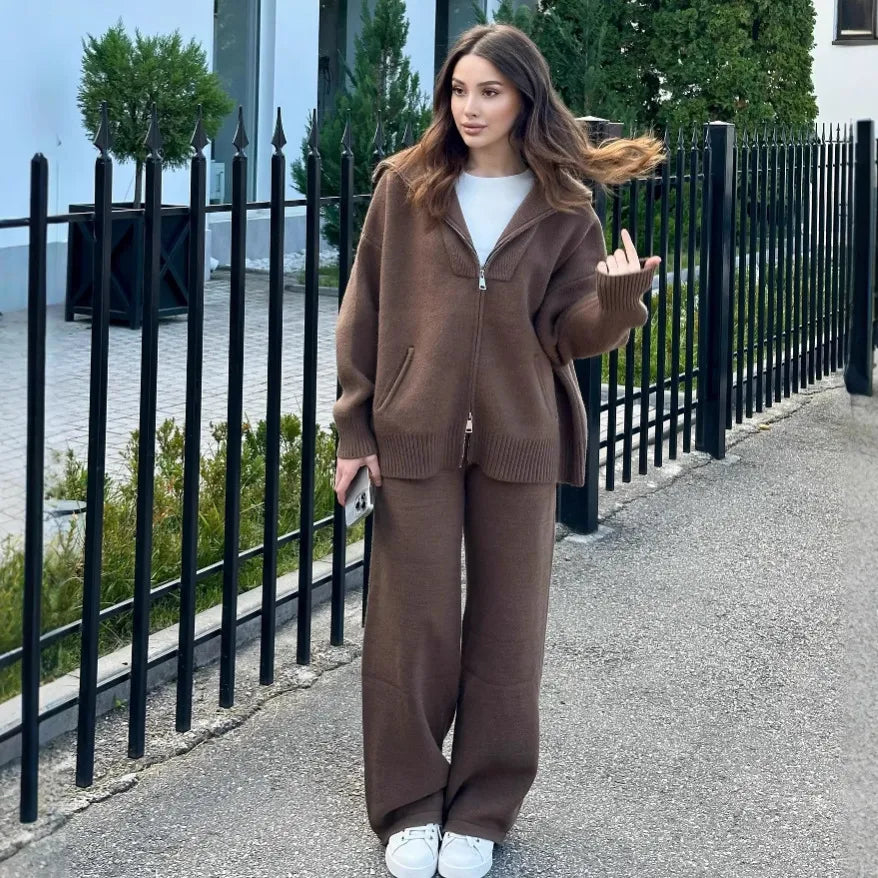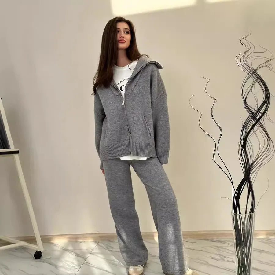 New European Style Slim Fit Knitted Sweater And Pants Two Piece Set Pure Color Collared Zipper Design Fashionable Casual Outfit