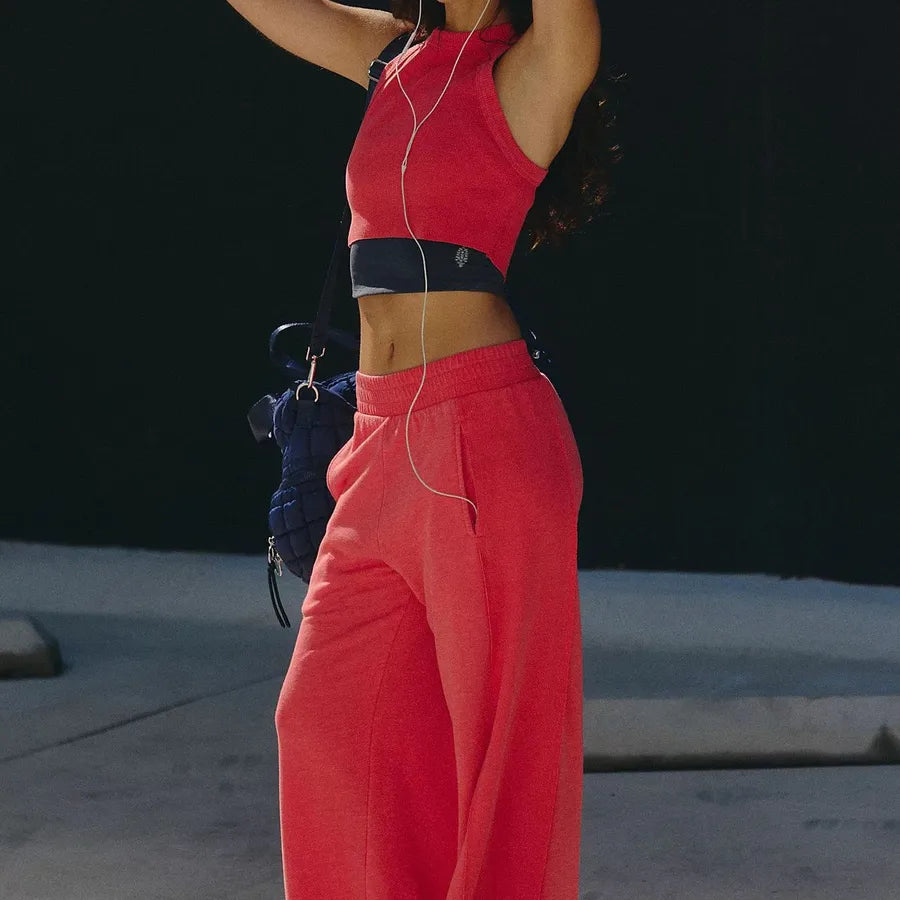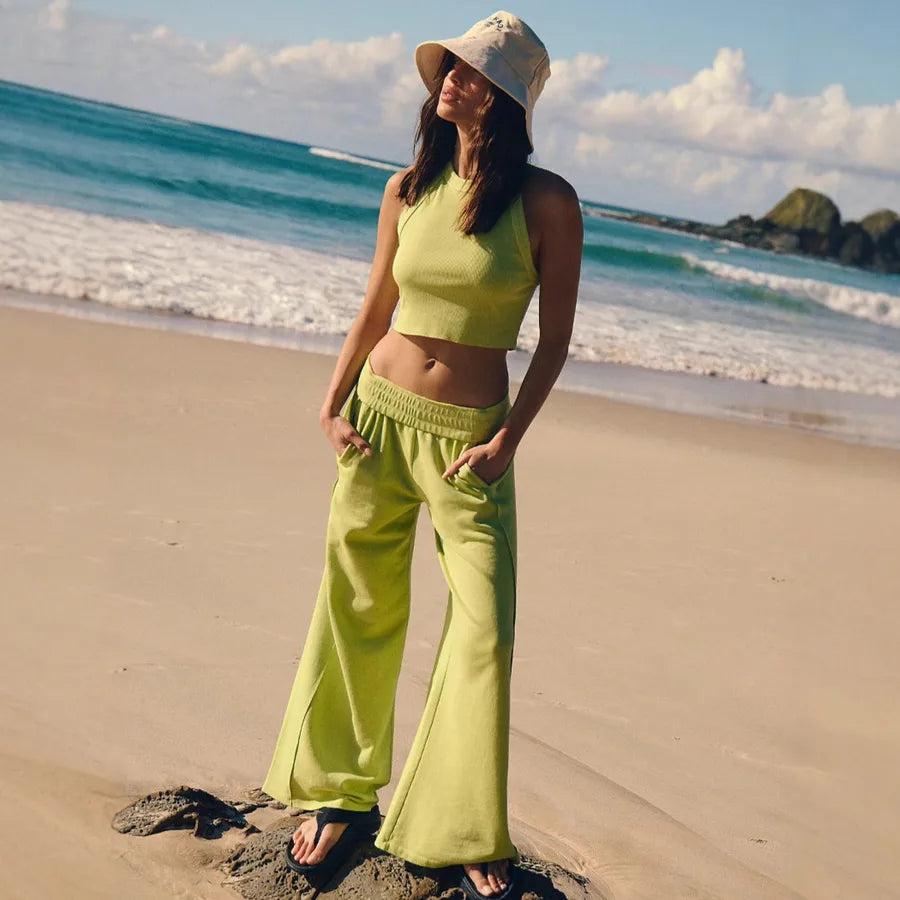 New Fashion Casual Set Women Solid High Elastic Shaping Short Sleeve Wide Leg Pants Two Piece Set Street Style Polyester Cotton