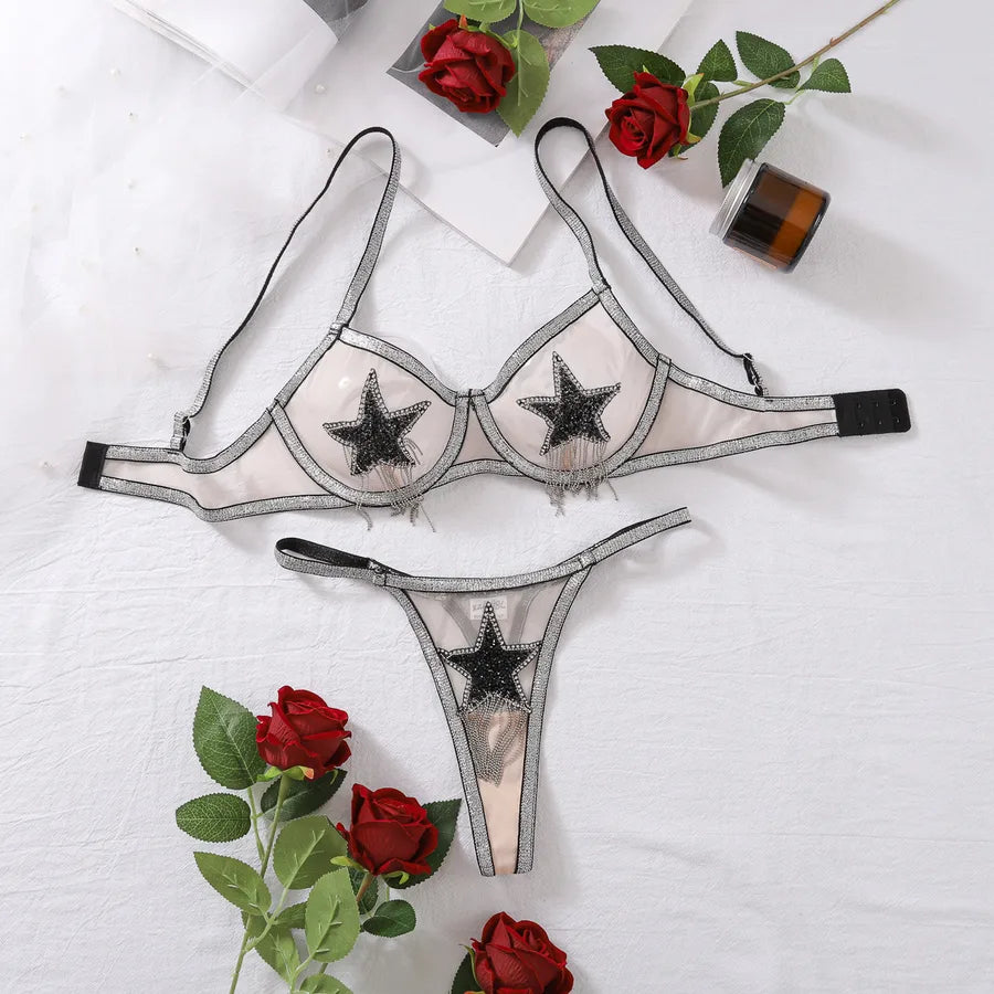 New Fashion Sexy Star Bra Set Mesh Perspective Temptation Sexy Underwear Thong Polyester Material