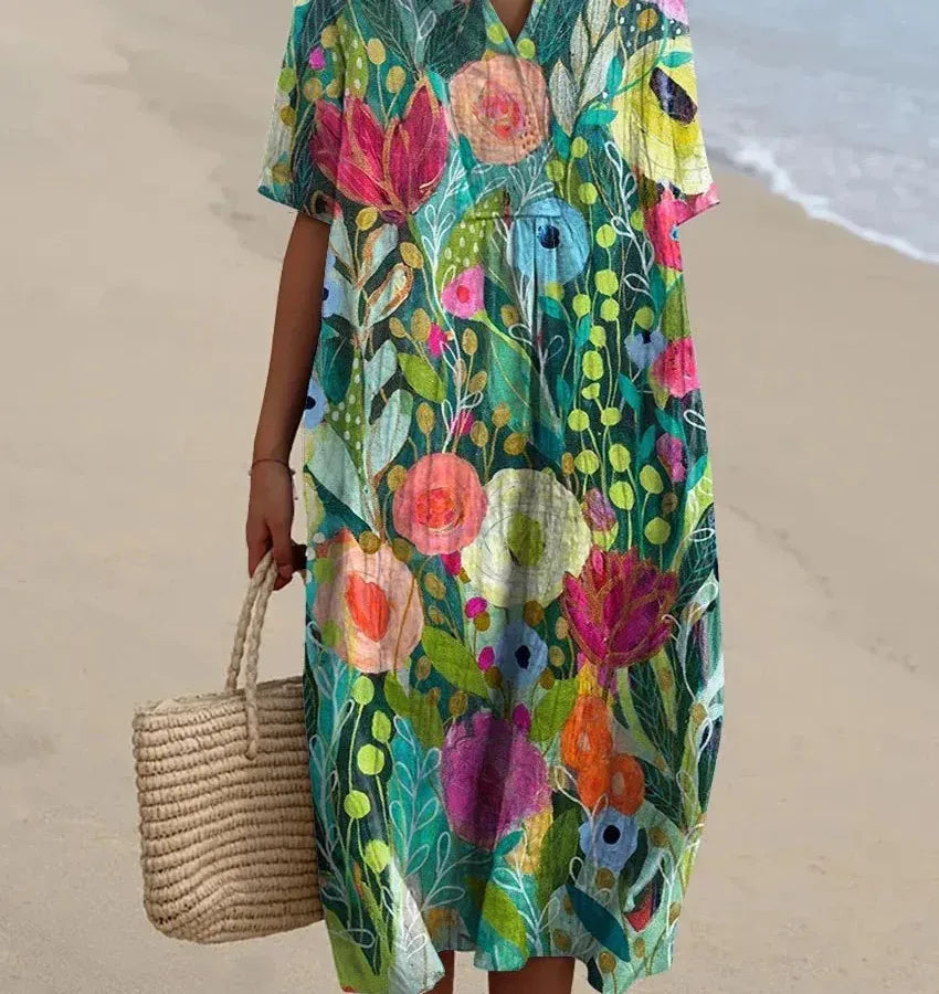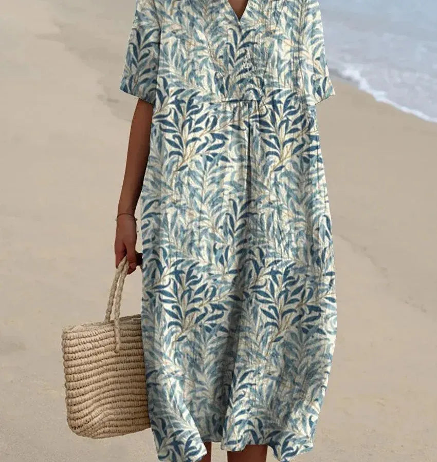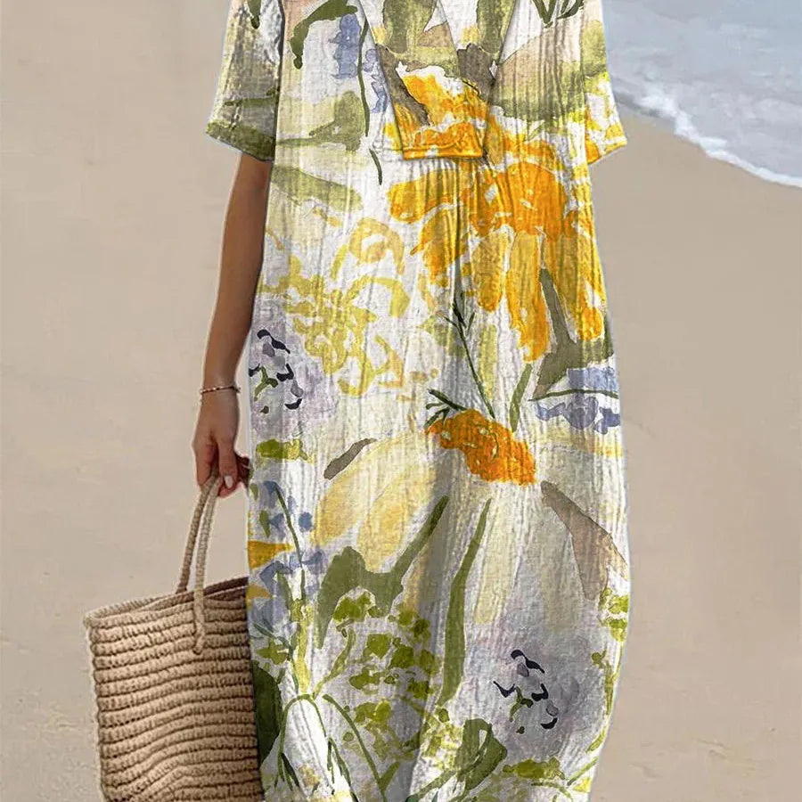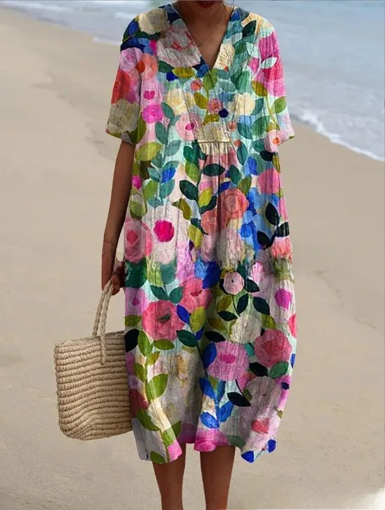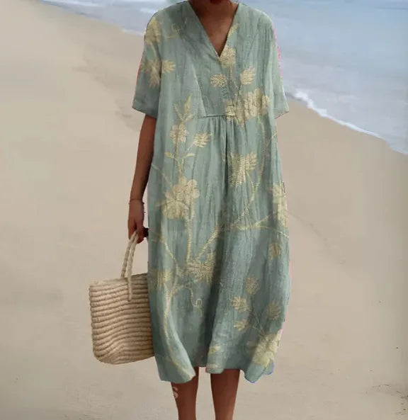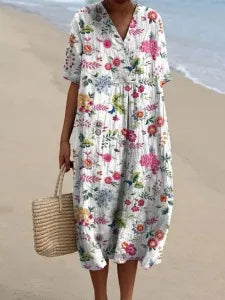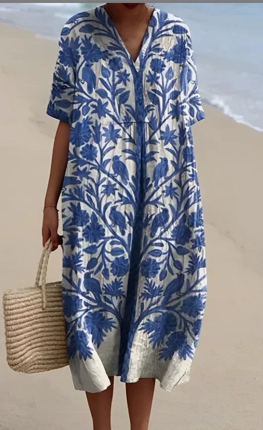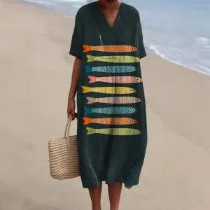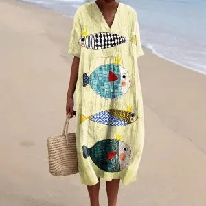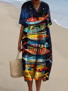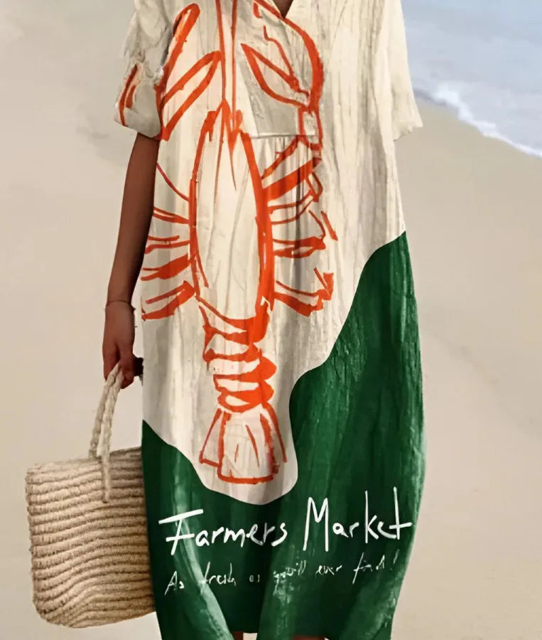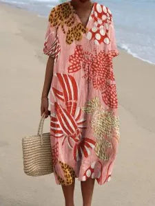 New Large Size Women's Shirt Dress With Pockets Creative Ocean Plant Vacation Style Short Sleeve Casual Ankle-Length Gown