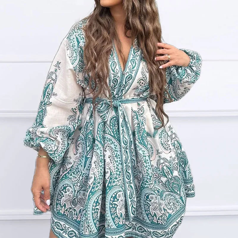 Retro European American Style Lantern Sleeve V-neck Print Short Dress Elegant Commute High Waist A-line Skirt Polyester