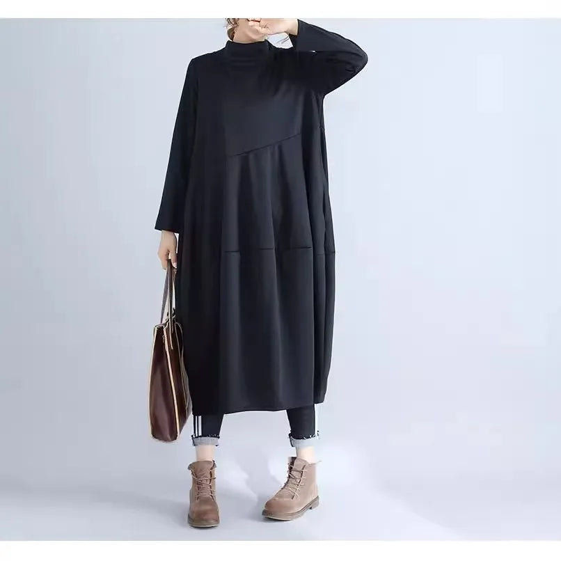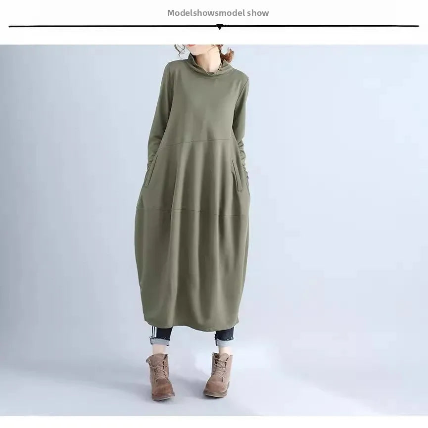 Retro Solid Color Lantern Sleeve Dress High Collar Cotton Linen Splicing Long Sleeve Women's Dress Autumn Winter Fashionable