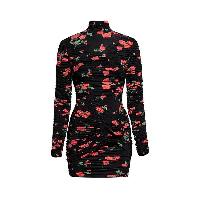 Sexy 3D Rose Flower Long Sleeve High Collar Party Evening Pink Mini Dress Women's Folded Skirt Gown