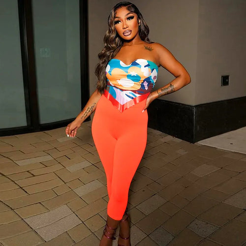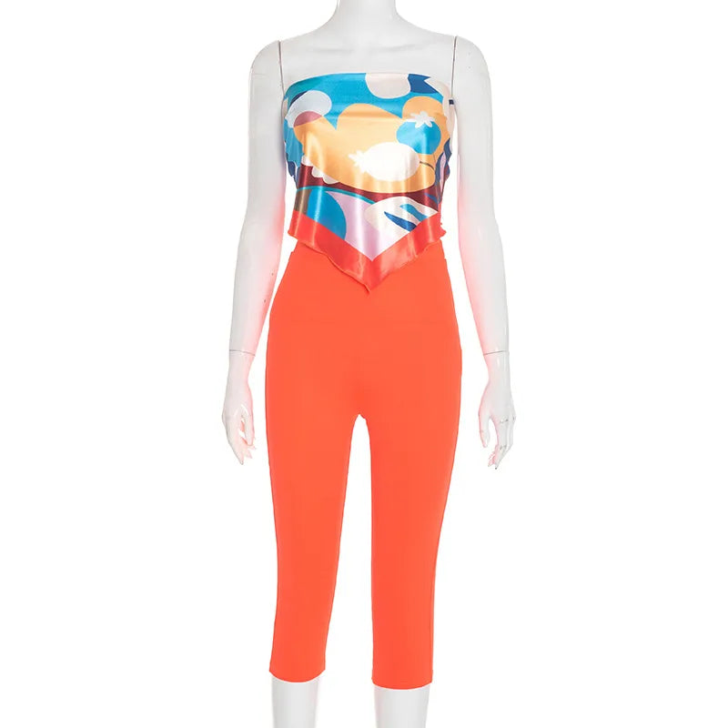 Sexy Backless Crop Top High Waist Seven-Five Pants Two-Piece Set Casual European Women's Fashion Silk Scarf Print Streetwear