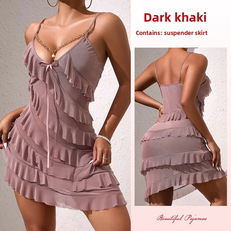 Sexy Short Slim Fit Strapless Dress Splicing Lace Edge Wave Pure Color Sleepwear V-neck Backless Dress