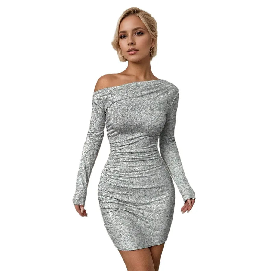 Sexy Slim Fit Long Sleeve One Shoulder Dress Bodycon Midi Dress Elegant Pure Color Knitted Fabric Style