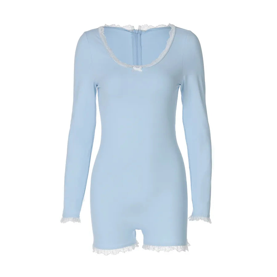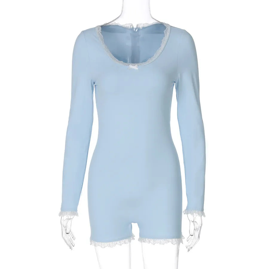Sexy U-Neck Lace Splice Back Zipper Slim Long Sleeve Onesie European Style Street Fashion Elastic Polyester Straight Leg Pants