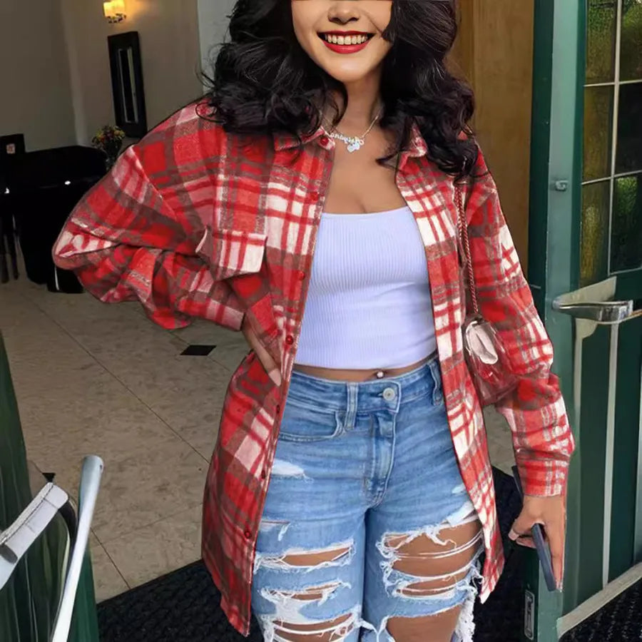 Shacket Long Sleeve Plus Size Tops Printing Streetwear Plaid
