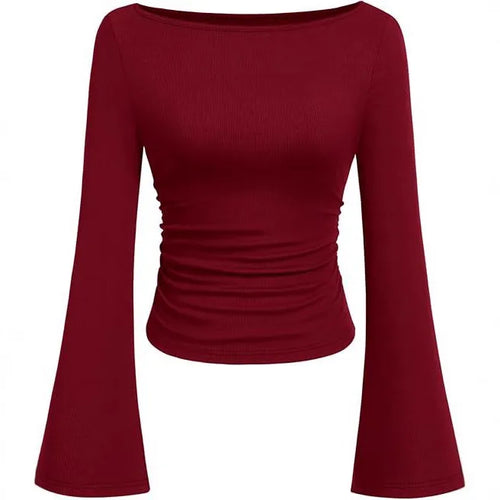 Slim Fit Long Sleeve T-Shirt Women's Autumn Style Bell Sleeve Crew Neck Pure Color American Style Plus Size Casual Top