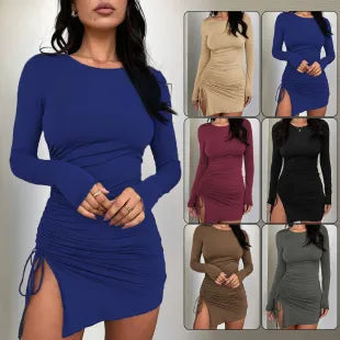 Slim Fit Sexy Women's Dress Pure Color Wrap Body Long Sleeve Round Neck Drawstring Y2K Street Style Midi Dress European Fashion