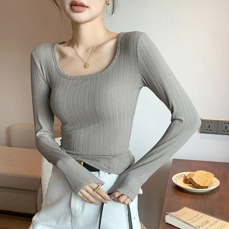 Slim Fit Women's Long Sleeve T-Shirt U-Neck Base Shirt Spring Style Casual New Fashion Striped/Plaid Fabric Low Cut Top