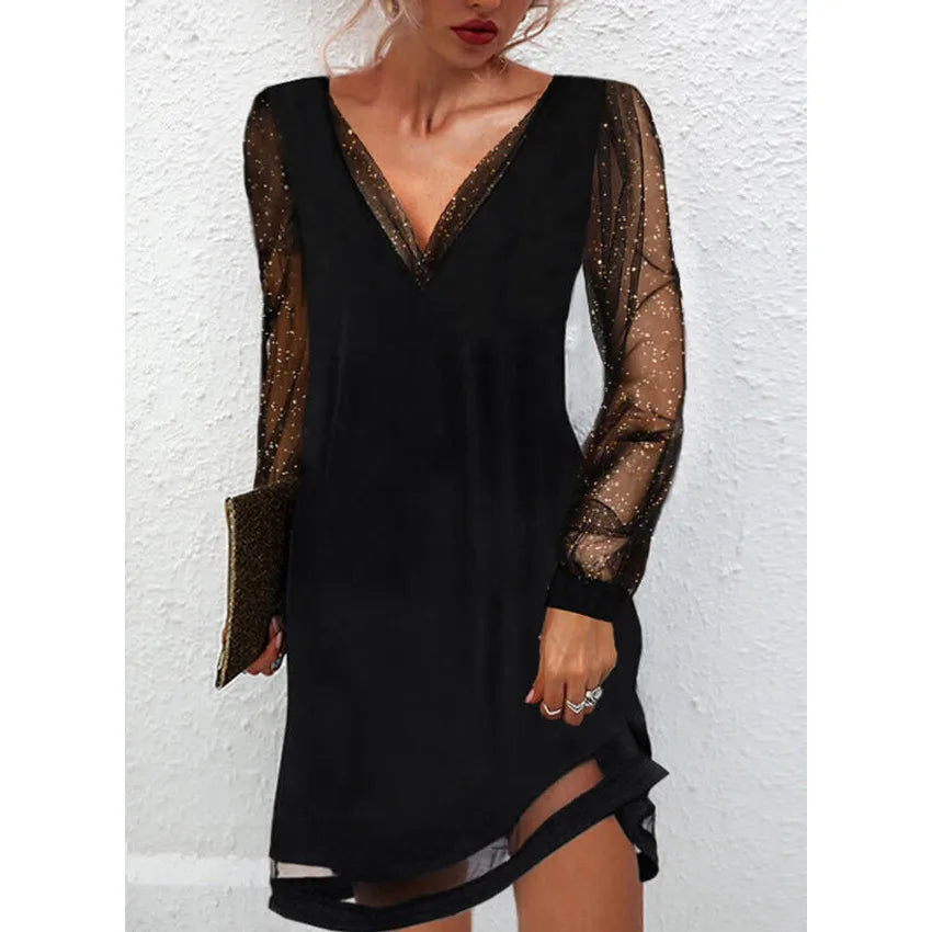 Spring Autumn Loose V-neck Sequin Mesh Long Sleeve Evening Dress Hollow Out Fashionable Dress Polyester Fabric Pure Color