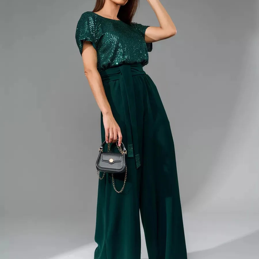 Spring Fashionable Glitter Short Sleeve Romper Casual Long Pants Style Bright Polyester Material