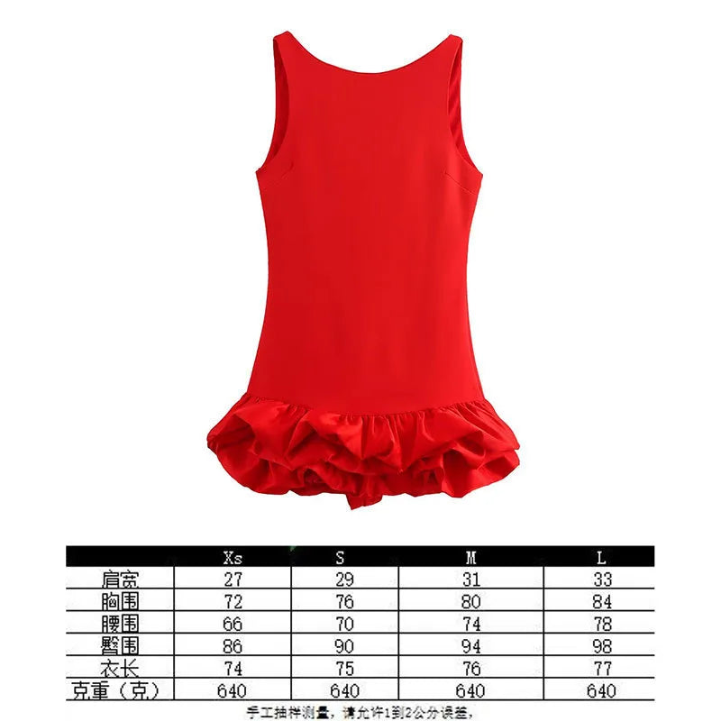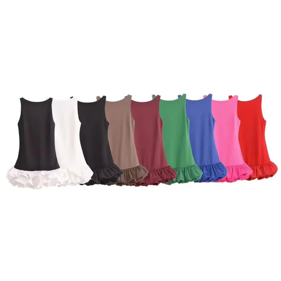 Spring New Women's Sleeveless Patchwork Vest Fluffy Hem Romper Dress European Style Autumn One-Piece Dress Pure Color Round Neck