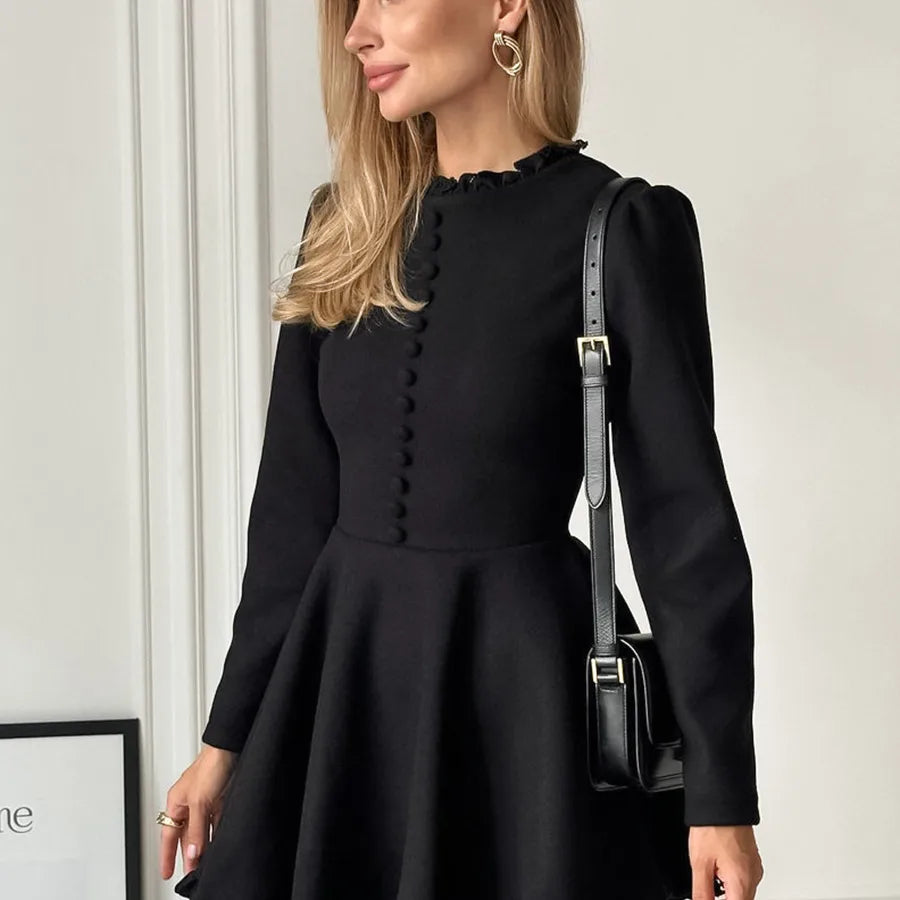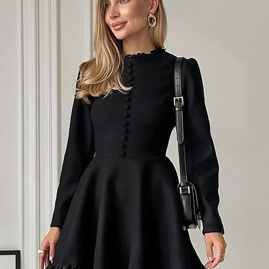 Spring Summer New Black Long Sleeve A-Line Dress Commute Women's Fashion Elegant Polyester Fiber Round Neck Basic Style Dress