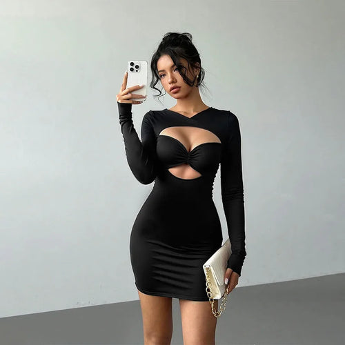 Spring Summer Sexy Long Sleeve Slim Fit Dress Style Elastic Fiber Polyester Round Neck Gored Pure Color