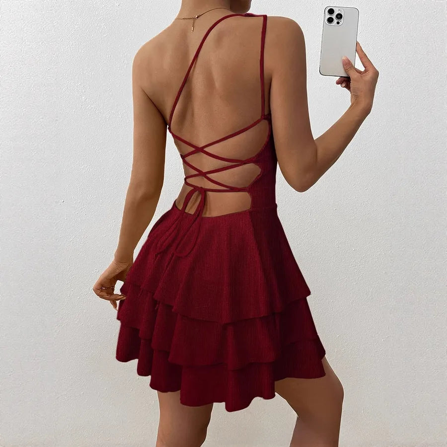 Summer 2025 New European Style Backless Short Skirt Waist Cinched Pleated Dress Hanging Neck Line Pure Color Nylon Polyester Fabric
