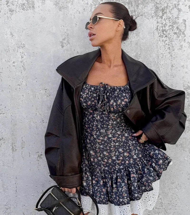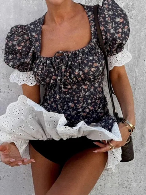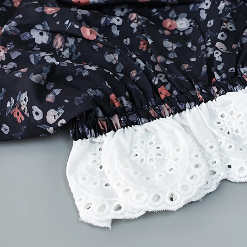 Summer French Lace Splicing Floral Print High Waist Women's Dress Fashionable Design Commute A-Line Skirt Short Sleeve