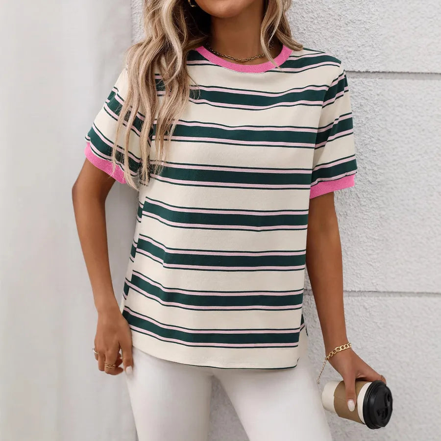 Summer Loose Fit Striped Color Block Short Sleeve Round Neck T-Shirt Women's Casual Street Style Cotton Blend Top